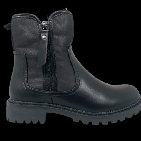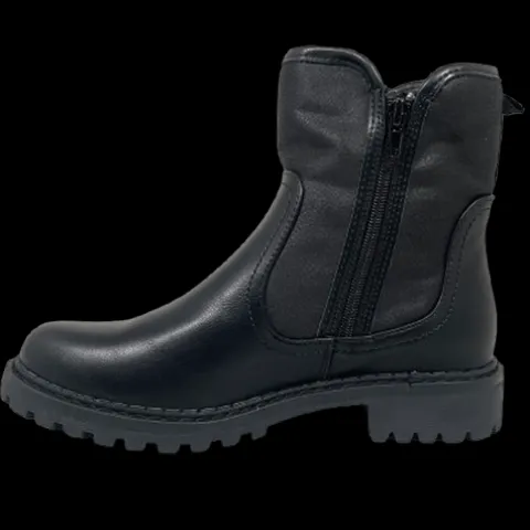 Dejlig 5th Avenue vinterstøvle med en overdel af imiteret glat skind og tekstil med en pyntelynlås på ydersiden af anklen. Støvlen lukkes med en lynlås på indersiden af anklen, og en trækfane bagpå gør det nemt at træde i støvlen. Indvendig har støvlen et blødt, lunt fleecefoer, og den udtagelige indersål er blød. Den kraftige og godt mønstrede ydersål er stødabsorberende med et godt fodfæste.