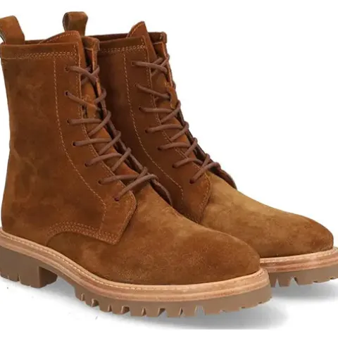 Lækker støvle med en overdel af ruskind med en trækfane bagpå. Støvlen justeres med snørebånd og lukkes med en lynlås på indersiden af anklen. Støvlen har et tætsiddende ankelhøjt skaft, og indvendig har den et tekstilfoer. Indersålen er komfortabel, og den kraftige og godt mønstrede gummisål med dekorativ stikningsrand er stødabsorberende med et godt vejgreb.