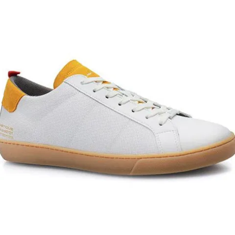 Skøn skind sneakers fra vores nye mærke Ambitious. Den mørkegule farve på pløs og bagkappe, frisker den hvide sneakers op, og rammer forårets modebillede så fint.
