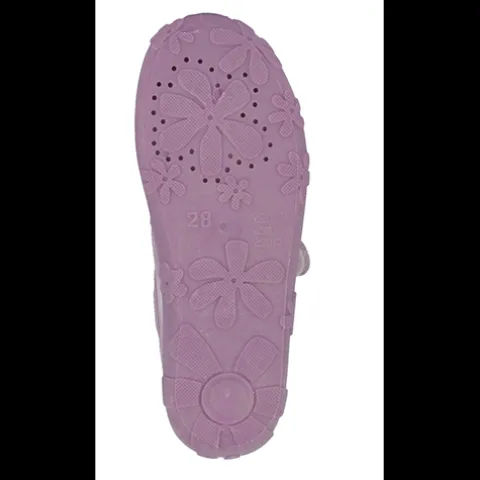 Dejlig Heaven hjemmesko af tekstil dekoreret med et print af en enhjørning og regnbue på forfoden og kantet med glittertekstil. Skoen lukkes med en velcrorem over vristen, og den fleksible gummiydersål er stødabsorberende og åndbar med et godt fodfæste.