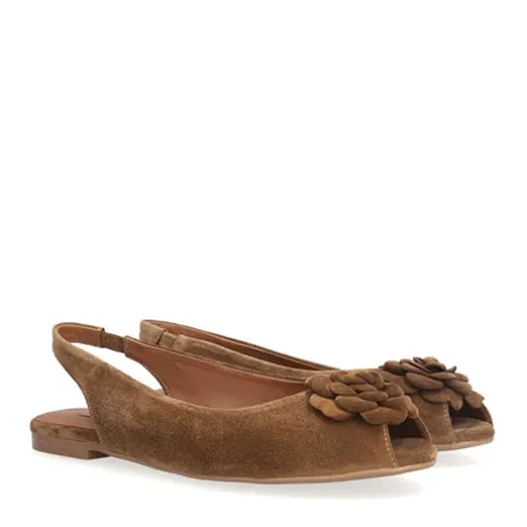 Sød og feminin peep-toe slingback med en overdel af blødt ruskind, dekoreret med en ruskindsblomst på forfoden. Slingback-remmen er udstyret med elastik, så den tilpasser sig din fod. Indvendig har skoen et skindfoer, og den polstrede dæksål er beklædt med skind, så du er sikret et optimalt fodklima. Ydersålen er fleksibel med et fint fodfæste. Håndlavet i Spanien.