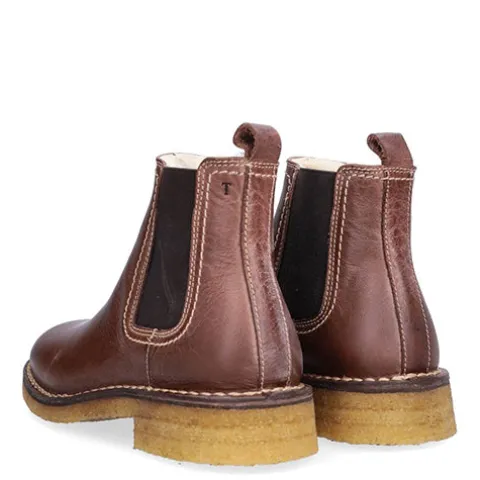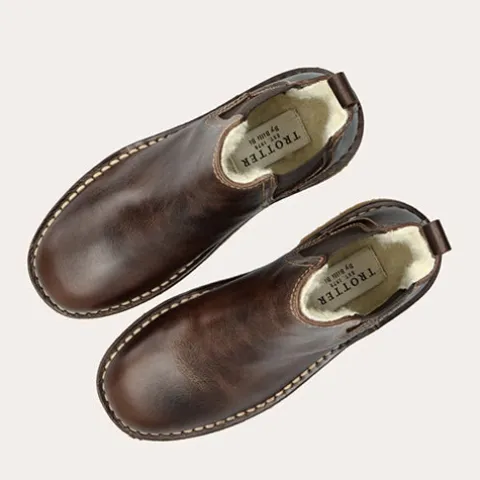 Håndlavet Trotter Chelsea-støvle med en overdel af glat skind og elastikpaneler på siderne. Støvlen er dekoreret med en strop bagpå samt syninger i kontrastfarve. Indvendig har støvlen et varmt uldfoer, og den udtagelige indersål er beklædt med uld. Den fleksible rågummisål er stødabsorberende med et fint fodfæste.