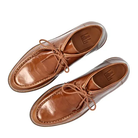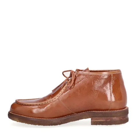 Håndlavet Venice desert boot med en overdel af lakeret skind med rund tå og moc toe-syning. Støvlen lukkes med snørebånd. Indvendig er støvlen foret med skind, og indersålen er blød. Den fleksible rågummiydersål er stødabsorberende med et godt fodfæste.