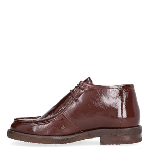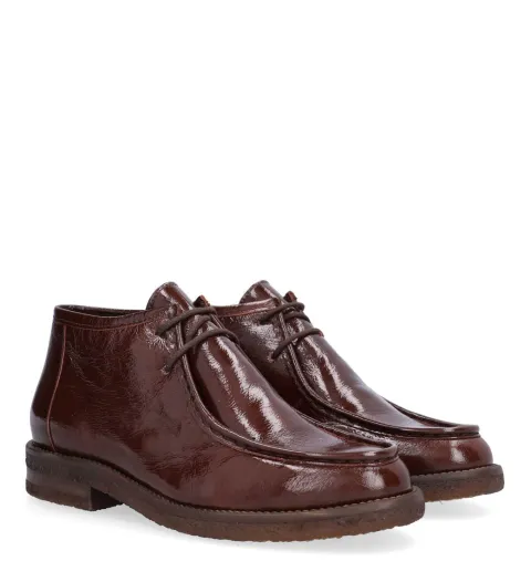 Håndlavet Venice desert boot med en overdel af lakeret skind med rund tå og moc toe-syning. Støvlen lukkes med snørebånd. Indvendig er støvlen foret med skind, og indersålen er blød. Den fleksible rågummiydersål er stødabsorberende med et godt fodfæste.