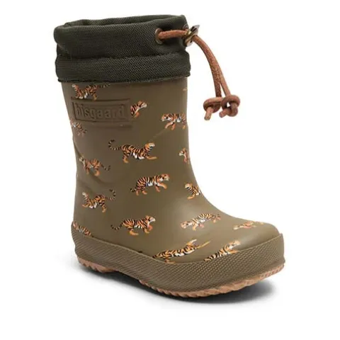 Lækker Safari termostøvle med en vandtæt overdel af naturgummi dekoreret med søde små tigre, og med et lunt, blødt lammeuldsfoer holdes fødderne både varme og tørre. Åbningen er kantet med en bred løbegang og har ruskindssnøre med metalstopper. Støvlen har en normal/bred pasform. Den udtagelige indersål er beklædt med varmt uldfoer, og den fleksible gummiydersål er stødabsorberende med et fint fodfæste. Termostøvlen er en pålidelig ven på kolde og våde regnvejrsdage og føles som en drøm for små fødder.