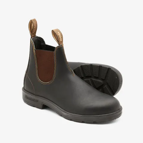 Klassisk Blundstone Originals #500 chelseaboot-støvle – unisex og perfekt til hverdagsbrug. Overdelen er af premium glat læder i en meget mørk brun farve med brune elastikpaneler på siderne, og trækfaner både for og bag gør det nemt at træde i støvlen, som har stålsvang samt en tæt pasform over vrist og tåområdet. Læderet i Originals-serien vil med tiden blive blødere og forme sig behageligt efter din fod. Den udtagelige indersål er åndbar, antibakteriel og vaskbar og holder fødderne behagelige og tørre, imens den formstøbte EVA-fodseng giver maksimal komfort. Den lette og varmebestandige TPU-ydersål har et godt mønster for et forbedret fodfæste, og med XRD®-teknologi i hælen får du optimal stødabsorbering. Den originale #500 model er moderne og alsidig og giver dine fødder ultimativ komfort.