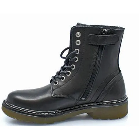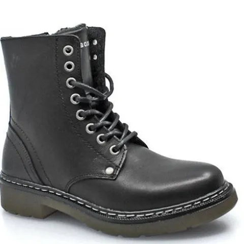 Snørestøvle fra Bullboxer i sort glat skind. Indvendig på skaftet et der lynlås. Støvlen er foret med lunt fleecefoer. Sølvfarvet Bullboxerlogo på pløsen.