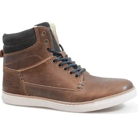 Snørestøvle fra Bullboxer i brunt skind og med lyse såler. Indvendig på skaftet et der lynlås. Støvlen er foret med et varmt tekstilfoer. Dæksål i skind.