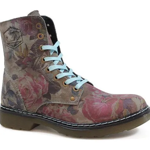 Snørestøvle fra Bullboxer med blomster påtrykt hele støvlen. Lyse turkise snørebånd og syninger rundt i sålkanten. Indvendig på skaftet et der lynlås. Støvlen er foret med et lundt tekstilfor.