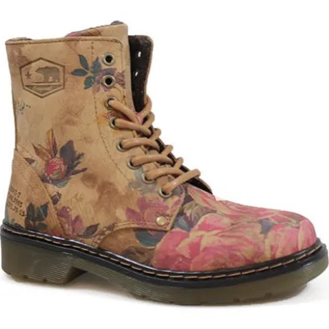 Snørestøvle fra Bullboxer med blomster påtrykt hele støvlen. Brune snørebånd og brune syninger rundt i sålkanten. Indvendig på skaftet et der lynlås. Støvlen er foret med et lunt fleecefoer.