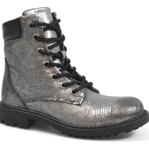 Snørestøvle fra Bullboxer med super flot præg i hele støvlen. Indvendig på skaftet et der lynlås. Støvlen er foret med et lunt fleecefoer og har dæksål i skind.