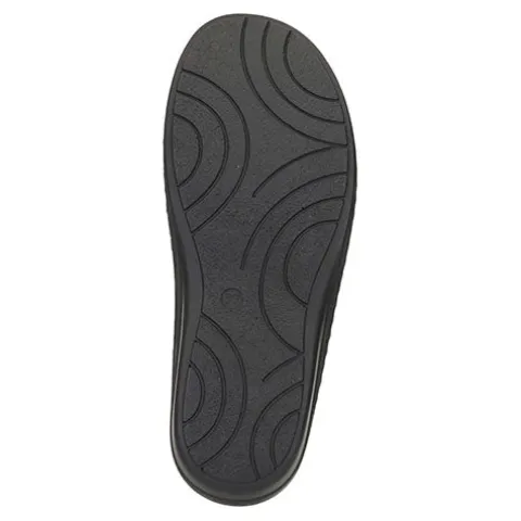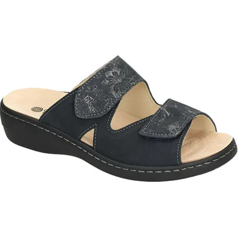 Fin slippers-sandal med to velcroremme over forfod og vrist. Remmene har et blåt mønster med sølvblomster. Den udtagelige dæksål er af skind, og den fleksible ydersål giver en behagelig bevægelighed.