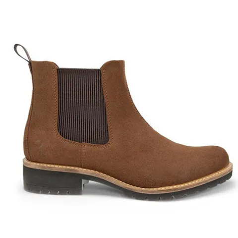 Lækker Elaina Chelsea-støvle med en overdel af ruskind med elastikpaneler på siderne og en trækfane bagpå. Indvendig har støvlen et tekstilfoer, og indersålen kan tages ud. Den fleksible og kraftigt mønstrede ydersål er stødabsorberende med et godt fodfæste.
