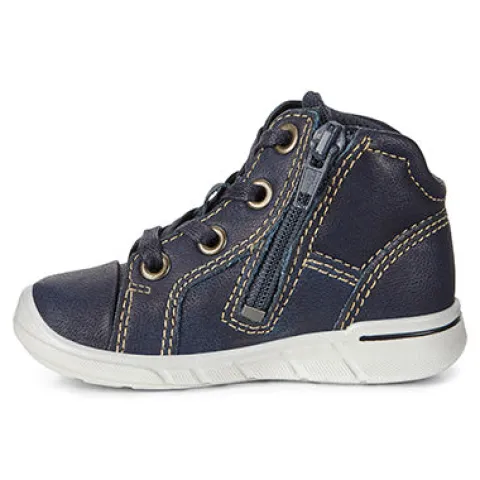 Super fin babysko fra ECCO i ny flot blå farve. Skoen har gule stikninger og brunt logo. Skoen er foret med tekstil og udtagelig dæksål i skind. Indvendig lynlås og snørebånd for optimal tilpasning.