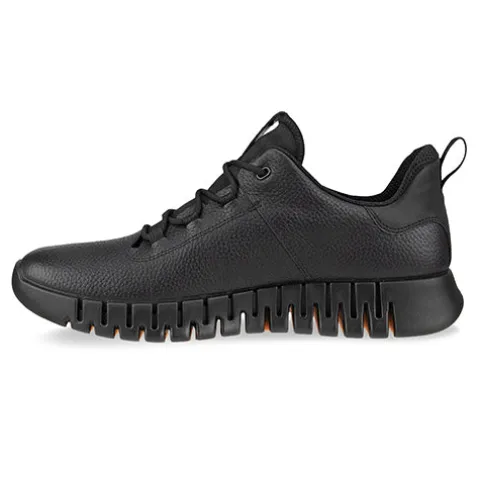 ECCO GRUUV sneakeren er specialudviklet til at give dig en behagelig gang og støtte i hvert eneste skridt og er designet til at være en landtidsholdbar sko med førsteklasses kvalitet til at opfylde dine behov på farten. En unik egenskab ved denne behagelige sneaker er den innovative gummisål, som er fleksibel og bøjelig to veje, så din fod kan bevæge sig frit uanset underlaget. Overdelen er af blødt læder med refleksdetalje på hælen. Skoen lukkes med et elastisk snørebånd, som sidder i udvendige snørehuller til hurtig justering på farten, og trækfaner på hæl og pløs gør det nemt at træde i skoen. Med en vandtæt og åndbar GORE-TEX-membran holdes fødderne behageligt tørre. Den udtagelige Dual Fit-indlægssål i komfortskum giver mulighed for to pasformer, hvor du kan tilpasse bredden individuelt. ECCO FLUIDFORM™ giver en naturlig anatomisk støttende pasform og fornemmelse, imens den dynamiske og stødabsorberende gummisål, som kan flekse to veje, giver dig et godt fodfæste og fuld udnyttelse af din fods bevægelser i enhver vinkel.