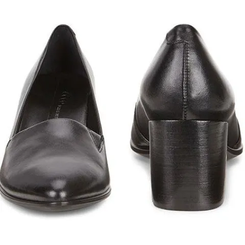 Moderne sko fra ECCO med tilspidset snude og blokhæl. Skindfor og dæksål i skind.