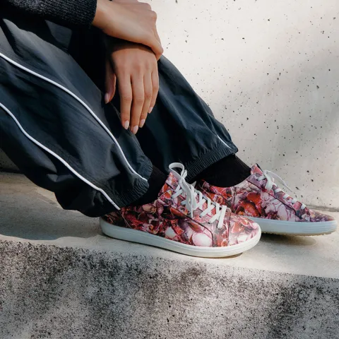 En moderniseret version af ECCO’s originale bestseller style, ECCO SOFT 7 sneakeren. Denne stilfulde model har et klassisk sneakerdesign med lange snørebånd, en overdel af blomstret skind og en tåkap i luksuriøst læder. Indvendig har skoen et blødt tekstilfoer, som er åndbart, og den udtagelige indersål er beklædt med skind for et optimalt fodklima. Indersålen kan tages ud for at regulere bredden. Den fleksible ydersål er stødabsorberende med et godt fodfæste.