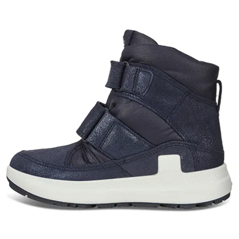 ECCO SOLICE K-støvlen er lavet af en kombination af tekstil og metallisk ruskind og er designet til at håndtere kolde vintereventyr. Denne model giver holdbarhed og et godt vejgreb takket være ydersålen af gummi. Et alsidigt look, der går over anklen og har dobbelt velcrolukning for en behagelig og justerbar pasform. Med metallisk ruskind for en glitrende effekt og refleksdetaljer.