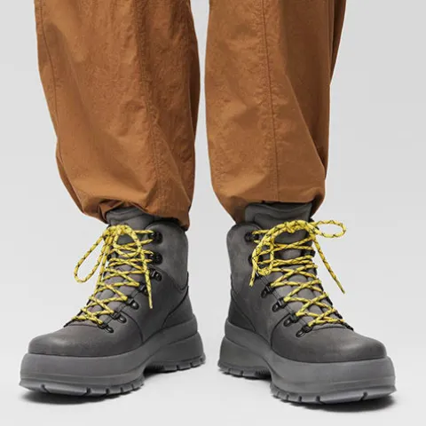 Lækker Track 30 M støvle med en overdel af fuldnarvet ECCO nubuck og olieret nubuck i flotte grå nuancer og med et snørebånd i kontrastfarven gul. Støvlen lukkes med snørebånd og kan snøres enten til over vristen eller over anklen. En trækfane bagpå gør det nemt at træde i støvlen. Åbningen er polstret for øget komfort, støtte og beskyttelse, og pløsen går et godt stykke op. Dine fødder holdes friske med det åndbare skindfoer og tekstilfoer, og med en indbygget vandtæt membran holdes fødderne behageligt tørre i al slags vejr. Den udtagelige indersål er åndbar og beklædt med skind. Du får ekstra komfort med FLUIDFORM™ infusionsteknologi, som former sig efter foden, og den kraftige, men lette TPU-ydersål er stødabsorberende med godt fodfæste.
