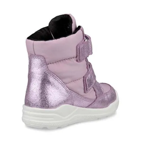 Sød og praktisk Urban Mini vinterstøvle beskytter fødderne og holder dem tørre og varme i koldt vejr. Overdelen består af åndbart tekstil og slidstærkt ECCO ruskind med glimmereffekt. Støvlen justeres og lukkes med to velcroremme, og åbningen er polstret for øget komfort og beskyttelse. Indvendig har støvlen et varmt syntetfoer og en vandtæt og åndbar GORE-TEX-membran, så fødderne holdes varme og tørre i vintervejr. Den udtagelige, isolerende indersål hjælper med at holde fødderne varme. ECCO FLUIDFORM™ Direct Comfort-teknologi sikrer en fleksibel og slidstærk mellem- og ydersål, som giver fødder i voksealderen den nødvendige støtte og komfort. Den fleksible ydersål er stødabsorberende og giver med sit unikke mønster et forbedret fodfæste. Her får du en stilfuld og praktisk støvle, som er perfekt til koldt vejr.