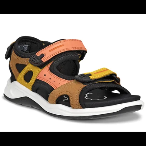Lækker sandal med en overdel af tekstil samt forskellige lædertyper, bearbejdet i ECCOs garverier, foret med åndbart tekstil, der hjælper med indvendig temperaturkontrol. Sandalen lukkes med tre velcroremme (forfod, vrist og hæl) for en optimal tilpasning til foden, imens en stabilitetsrem på ydersiden giver ekstra støtte langs fodens udvendige konturer. Den mikrofiberbeklædte dæksål giver komfort hele dagen. Den lette mellemsål giver god affjedring og komfort, mens den fleksible og slidstærke ydersål sikrer forbedret fodfæste og giver små fødder i voksealderen den nødvendige støtte og komfort. Herudover er den stødabsorberende ydersål unikt to-tonet med en gummi-del og en PU-del.