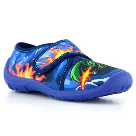Superfed Boogy hjemmesko med en overdel af tekstil dekoreret med print af flammer og en drage, der spyr ild. Skoen lukkes med en velcrorem over vristen. Den fleksible ydersål giver et godt fodfæste.