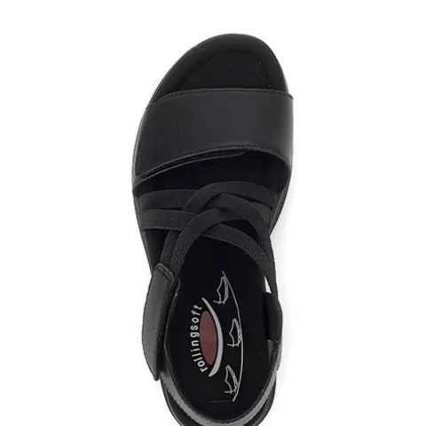 Lækker Rollingsoft sandal med en overdel af glat skind og elastikker. Sandalen lukkes med to velcroremme over forfod og vrist. Den tekstilbeklædte og polstrede dæksål er støddæmpende og komfortabel, og den fleksible ydersål med 2 cm kile er stødabsorberende med et fint fodfæste. Fås i halve størrelser.