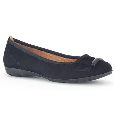 Flot ballerinasko med pynt på forfoden. Overdelen er af ruskind foret med tekstil, og den åndbare indersål er beklædt med skind. Den fleksible og stødabsorberende gummiydersål har et godt mønster og giver et godt fodfæste, og med Gabors Hovercraft luftkammersåler med dæmpende skum får du mere komfort og støtte til foden. Fås i halve størrelser.