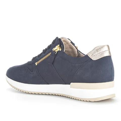 Smart Soft sko med en overdel af nubuck. Skoen justeres med brede, flade snørebånd og lukkes med to lynlåse på hver sin side af snørebåndet, så skoen kan åbnes vidt, og derfor er det nemt at få foden i den. Indersålen kan tages ud, og den stødabsorberende, kraftigt mønstrede gummiydersål giver et godt vejgreb. Fås i halve størrelser.