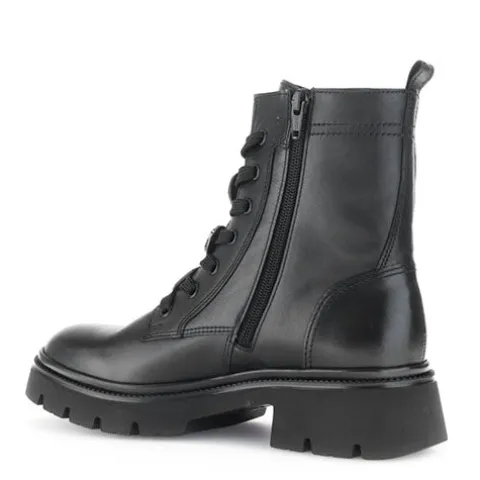 Dejlig støvle med en overdel af glat skind. Støvlen justeres med snørebånd og lukkes med en lynlås på indersiden af anklen, og en trækfane bagpå gør det nemt at træde i støvlen. Snørebåndet er pyntet med tre “facetslebne” knapper med hver sin store “diamant” (hhv. rund, firkantet og hjerte), som kan tages af snørebåndet. Indvendig har støvlen et let og lunt tekstilfoer, og indersålen kan tages ud. Den kraftige gummiydersål er stødabsorberende med et godt vejgreb. Fås i halve størrelser.