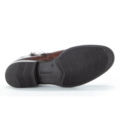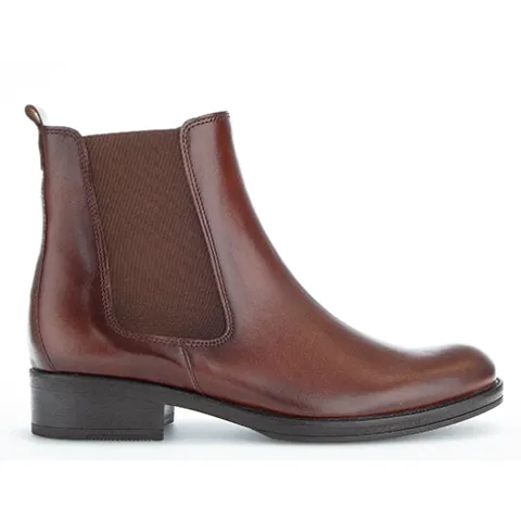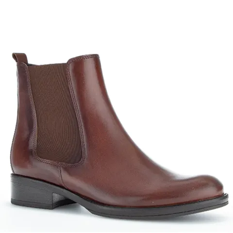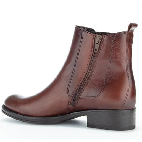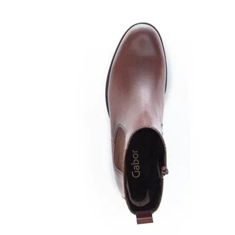 Fin ankelstøvle fra Gabor i glat skind med en flot rødbrun farve. Støvlen lukkes med lynlås på indersiden af anklen, og et elastikpanel på ydersiden øger støvlens tilpasning til anklen. En trækfane bagpå gør det nemt at træde i støvlen. Indersålen kan tages ud, og ydersålen giver et godt fodfæste.