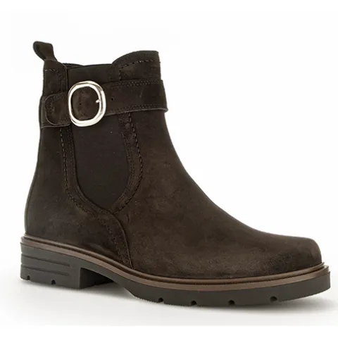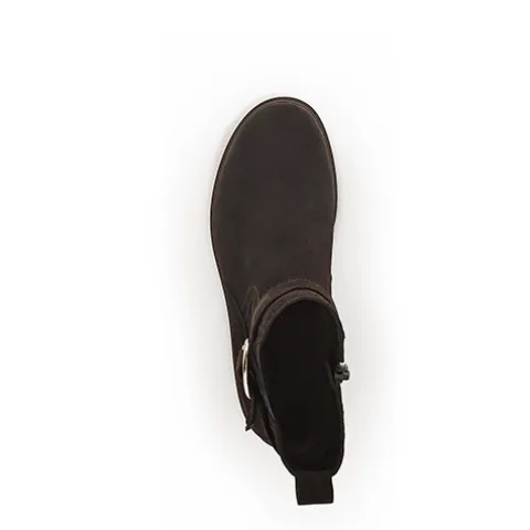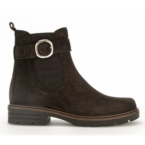 Flot ankelstøvle fra Gabor med en overdel af ruskind, dekoreret med en rem med pyntespænde om anklen. Støvlen lukkes med en lynlås på indersiden af anklen, og et elastikpanel på ydersiden øger støvlens tilpasning til anklen. En trækfane bagpå gør det nemt at træde i støvlen. Indvendig er støvlen foeret med et uldent tekstilfoer, som holder fødderne lune. Indersålen kan tages ud, og den fleksible ydersål giver et godt fodfæste.