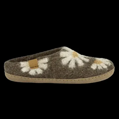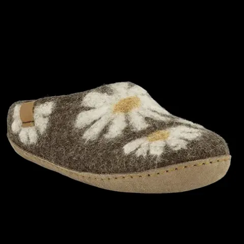 Superlækker Makalu hjemmesko af uldfilt håndlavet i Nepal. Overdelen er dekoreret med filtede margueritblomster, og en af skoene bærer initialet på den kvinde, der har skabt netop det par. Hjemmeskoen er meget fleksibel, og med en integreret EnergySole er den også komfortabel. Ydersålen består af ruskind.