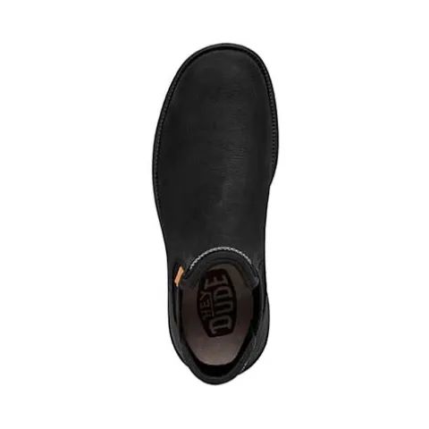 Lækker Branson M Chelsea-støvle med en vandafvisende overdel af nubuck med elastikpaneler på inder- og ydersiden af anklen samt et HeyDude-logo syet på hælen. Støvlen er en slip on-model med påsyede tekstilkanter i åbningen samt en elastiksnøre bagpå, der fungerer som trækfane, så støvlen er nemt at træde i. Den udtagelige indersål af skum er tyk, komfortabel og åndbar, og den fleksible ydersål har gummibelægninger og er stødabsorberende med et fint fodfæste.