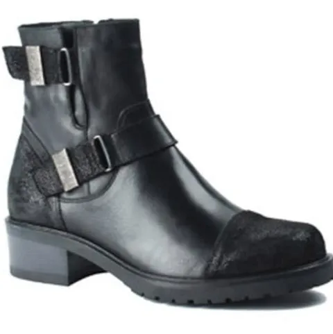 Rå støvle fra Hosis i lækkert blødt skind. Støvlen har fine detaljer med pyntespænder og ruskind med let glimmer på hæl og tå. Indvendig er der lynlås, og støvlen er foret med skind og har dæksål i skind.