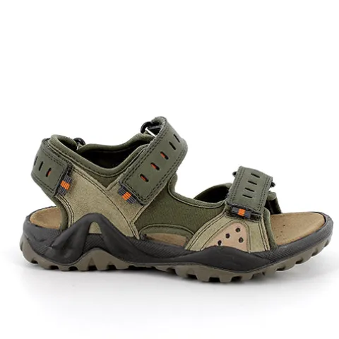 Sej outdoor sandal med en overdel af skind, syntet og tekstil. Sandalen lukkes med tre velcroremme, hvilket giver optimale tilpasningsmuligheder. Den komfortable dæksål beklædt med ruskind er åndbar og støddæmpende, og den fleksible ydersål er stødabsorberende med et godt fodfæste.