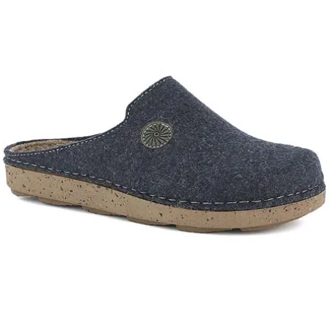 Lækker og fodformet slipper-hjemmesko med en overdel af filt dekoreret med et påsyet rundt mærke. Dæksålen er komfortabel, mellemsålen er støddæmpende, og ydersålen er fleksibel med et godt mønster, der giver et forbedret fodfæste. Lavet i Ukraine.