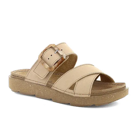 Dejlig slippers-sandal med en overdel af syntet i skindlook. Sandalen kan justeres med en rem med spænde over vristen. Den polstrede indersål er beklædt med ruskind, og den fleksible ydersål er stødabsorberende med et fint fodfæste.