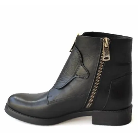 Læder støvle i blødt og lækkert skind. Støvlen har en indvendig guldlynlås og spænde og lynlås over foden. Dæksål i skind, og bløde, fleksible såler.
