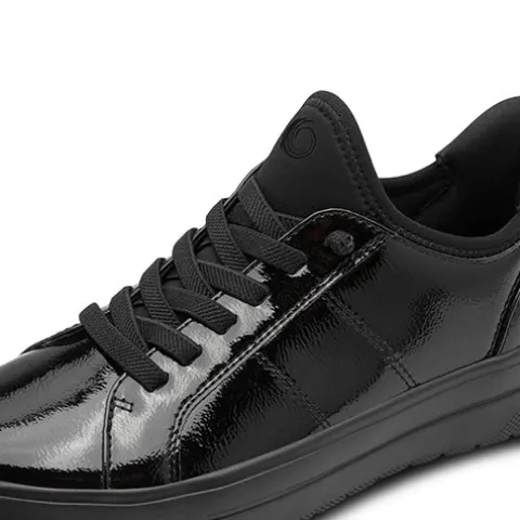 Flot sko med en overdel af lakeret syntet, tekstil og guldfarvet syntet på hælen. Skoen er en Step-in-model, så du kan træde i den uden at bukke dig eller bruge hænderne. En elastiksnøre på forfoden sørger for, at skoen tilpasser sig foden i løbet af dagen, og med vidde H er der plads til den bredere fod. Den udtagelige indersål er blød, polstret, komfortabel og støddæmpende, og den superlette ydersål er stødabsorberende. 100 % vegansk.