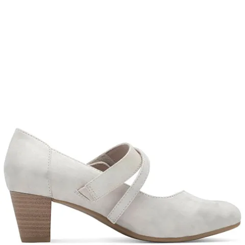 Flotte pumps fra Jane Soft Line-serien med en overdel af tekstil med metalprint. Skoen lukkes med en smart todelt velcrorem over vristen, dekoreret med glitrende sten. Den polstrede indersål er ekstra komfortabel, og med en vidde H-læst er der god plads til den bredere fod. Ydersålen under forfoden er af gummi og giver et godt fodfæste, og den robuste hæl med 5 cm højde har et flot trælook. 100 % vegansk.