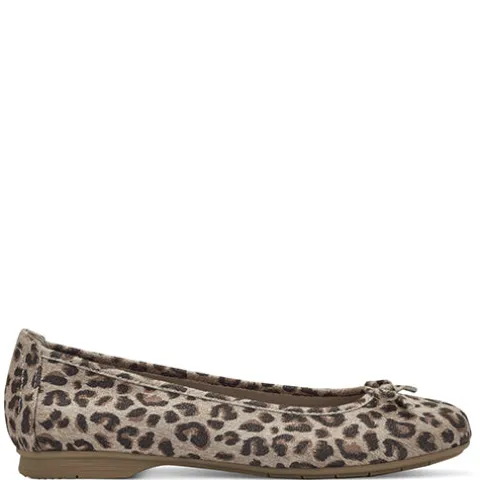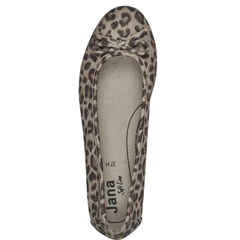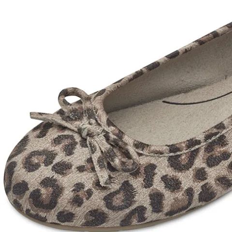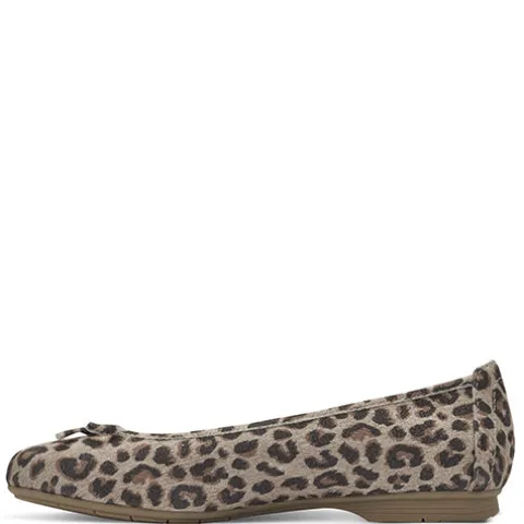 Smart og komfortabel Soft Line ballerinasko med en overdel af tekstil med leopardprint, dekoreret med en sløjfe på forfoden. Soft Line-indersålen er blød, og med vidde H er der plads til den bredere fod. Den fleksible gummiydersål er stødabsorberende og giver et fint fodfæste. Er 100 % vegansk.