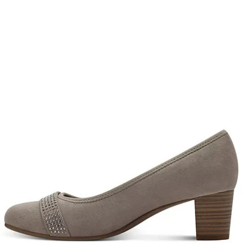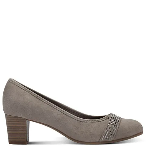 Fin pump fra Jana Soft Line-serien med ekstra komfort i dæksålen. Overdelen er af tekstil i ruskindslook foret med tekstil. Forfoden er dekoreret med en rem dekoreret med glitrende similisten. Med vidde H er der komfortabel plads til den bredere fod, og den polstrede Soft Line-indersål bidrager til komforten. Den flotte og robuste hæl i trælook er ca. 5 cm høj, hvilket understreger din femininitet uden at gå på kompromis med komforten. Den fleksible gummiydersål under forfoden giver et fint fodfæste. 100 % vegansk.