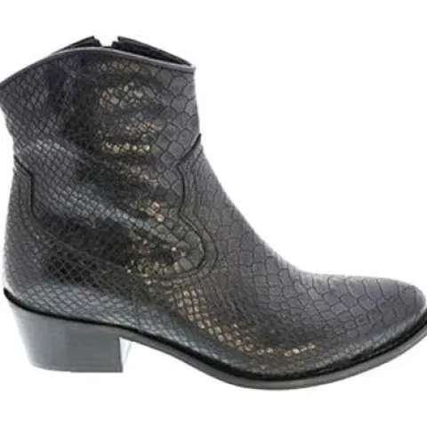 Lazamani støvle i flot slangepræget skind. Støvlen har en westerninspireret hæl på ca 5 cm. Snuden er tilspidset og er foret med tekstil.