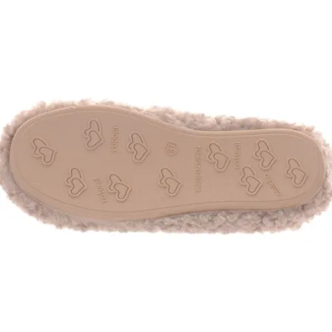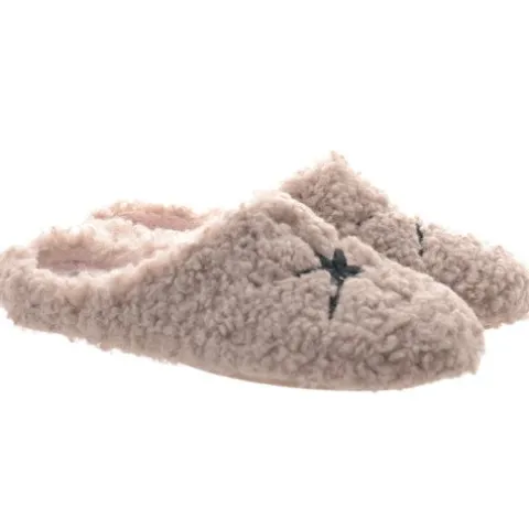 Lun og hyggelig slippers-hjemmesko med en overdel af tekstil i lammeuldslook, dekoreret med en sort, sekstakket kompasstjerne på forfoden. Hele skoen er foeret med et blødt og lunt tekstilfoer. Den udtagelige indersål er polstret, komfortabel og belagt med blødt foer, og den meget fleksible gummiydersål giver et fint fodfæste og beskytter mod kulde nedefra. Der medfølger en sød skopose.
