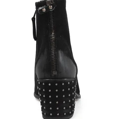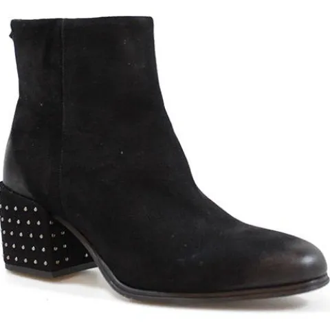 Mjusstøvle med nitter på hælen og pyntelynlås bagpå. Støvlen er pudset på snuden, så den har et slidt udtryk. Lynlås på indersiden af skaftet, foer og dæksål i skind.
