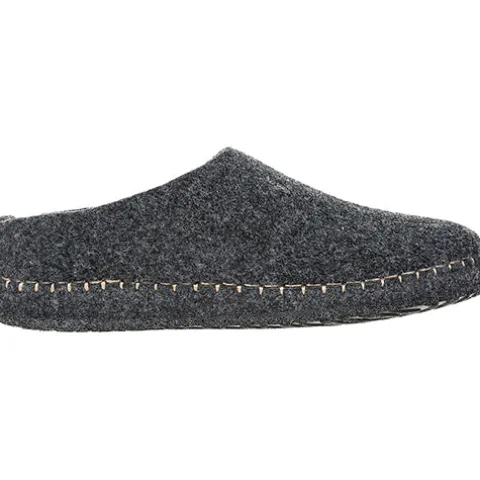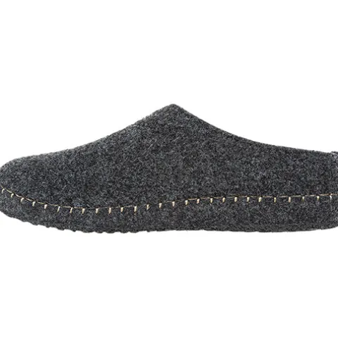 Bløde tøfler fra Mols med lyse stikninger rundet i sålkanten.