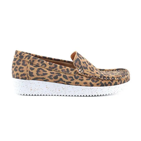 Lækker Elin loafer fra Nature med leopardprint. Skoen er blød, fleksibel og komfortabel og har mokkasinsyning på forfoden. Overdelen er af ruskind, og sålen består af ergonomisk naturgummi med korkrester. Her får du et par loafers perfekt til både hverdag og fest.