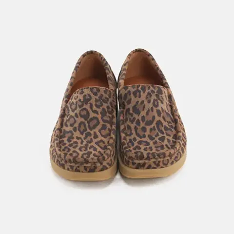 Lækker Elin loafer med en overdel af ruskind med leopardprint. Skoen er blød, fleksibel og komfortabel og har mokkasinsyning på forfoden. Indersålen er komfortabel, og ydersålen består af ergonomisk naturgummi med korkrester. Her får du et par loafers perfekt til både hverdag og fest.
