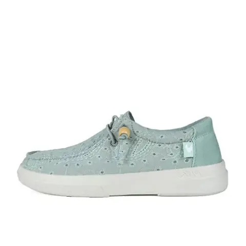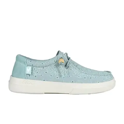 Lækker Kila Wallabi sko med en åndbar og smukt broderet overdel af 100 % bomuld samt ruskind på hælen med en moc toe-syning på forfoden. Skoen er udstyret med en elastisk snøre, som ikke skal bindes, og snørens ender er dekoreret med en træperle, som nemt kan tages af. Åbningen er polstret for øget komfort, og indvendig har skoen et blødt bomuldsfoer. Den ekstratykke, polstrede og udtagelige EVA-indersål beklædt med skind er åndbar og fugttransporterende og giver høj komfort hele dagen. Den fleksible og lette EVA-ydersål er stødabsorberende med et fint fodfæste. Her får du en superlet og komfortabel Wallabi-sko, som nem at tage af og på, og som holder dig cool hele sæsonen.
